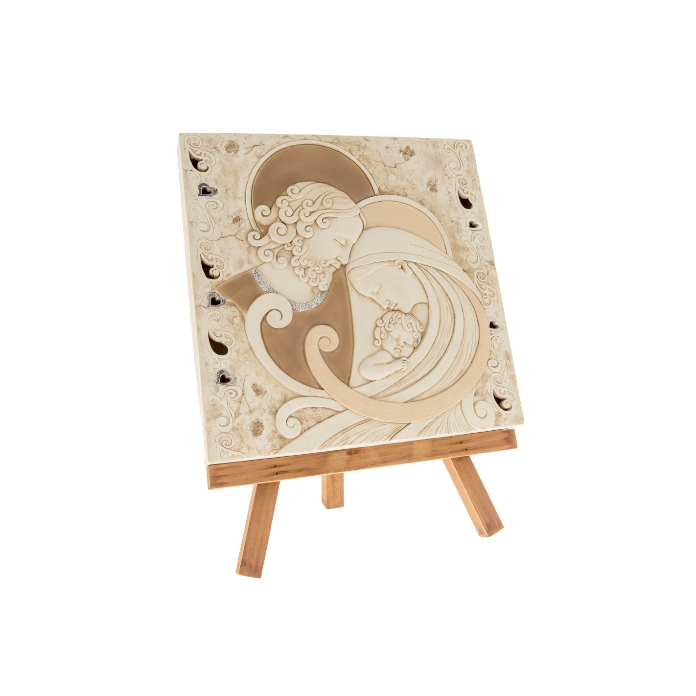Icona in resina Avorio Quadrata con simbolo Sacra Famiglia su piedistallo in Legno da appoggio ideale per decorazione o Bomboniera .