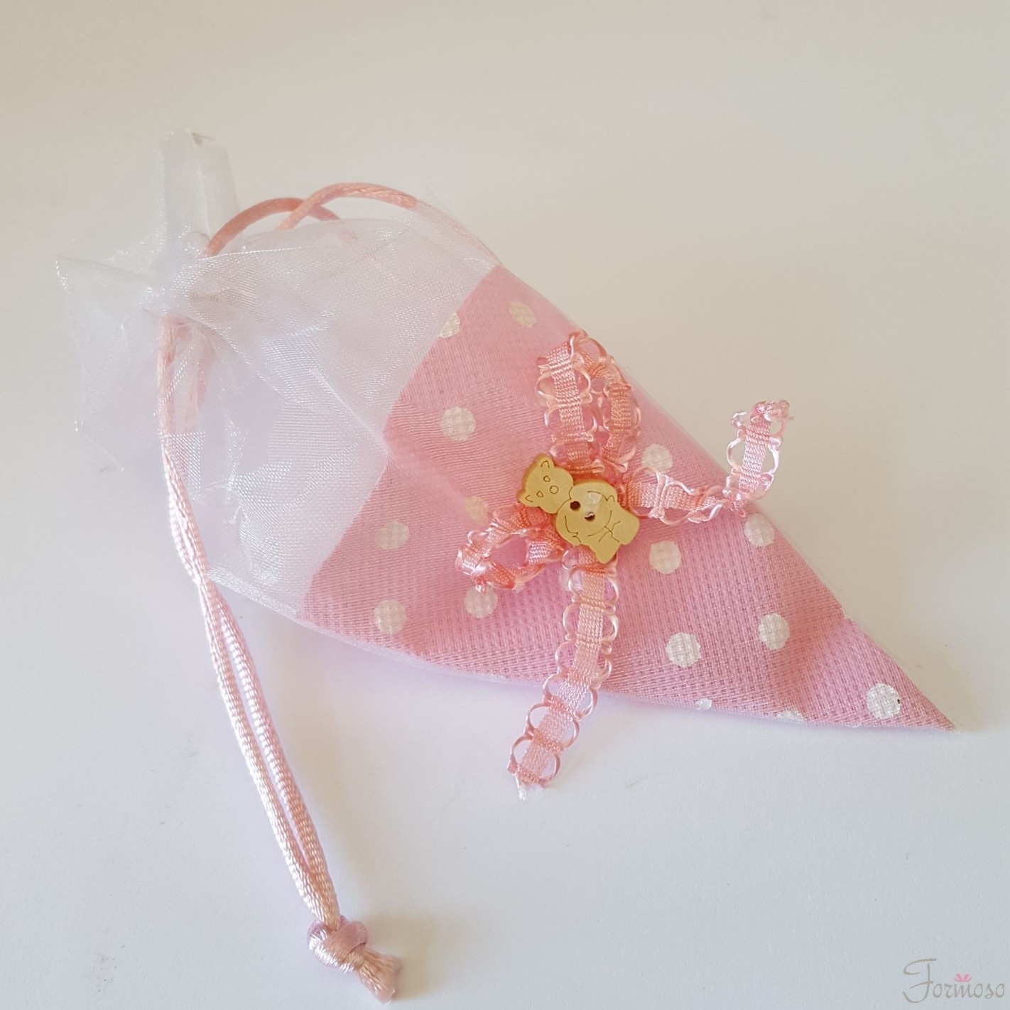 Sacchetto Tipo cono porta confetti in tessuto rosa a pois Bianchi ed inserto orsetto in legno, ideale per confettata o bomobniera Battesimo Nascita Compleanno o festa a tema.