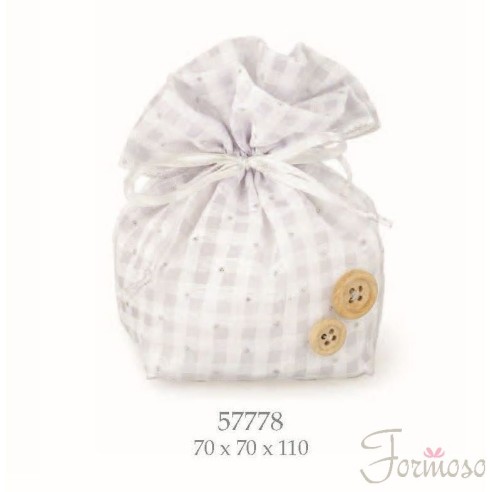 SACCHETTO PORTA CONFETTI IN COTONE A QUADRI BIANCHI E GRIGI CON INSERTO BOTTONE LEGNO IDEALE PER TUTTE LE OCCASIONI .