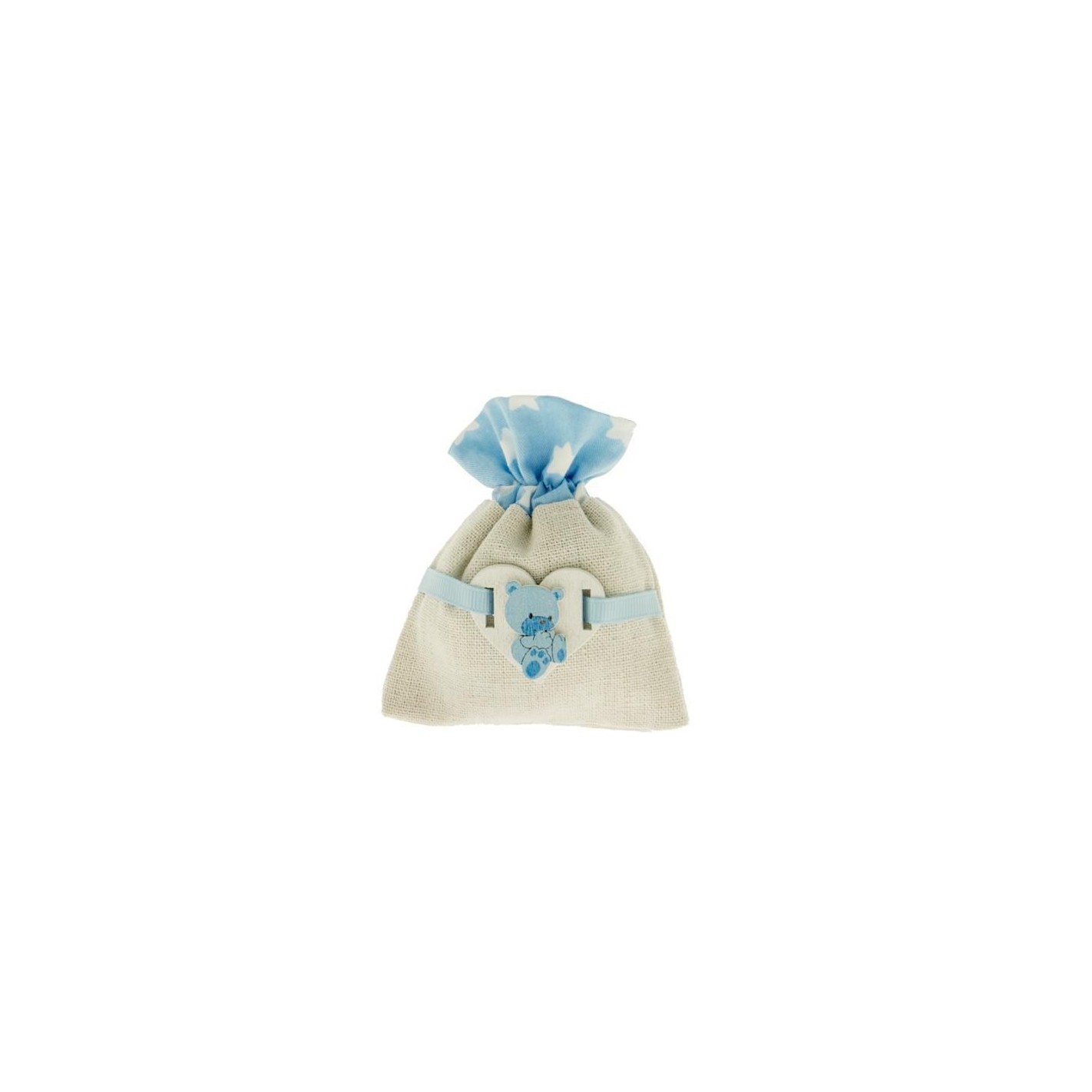 Bomboniera Sacchetto confetti in tessuto Celeste e Beige 8 x h 10 cm con inserto cuore Orsetto 12 pz art C2258
