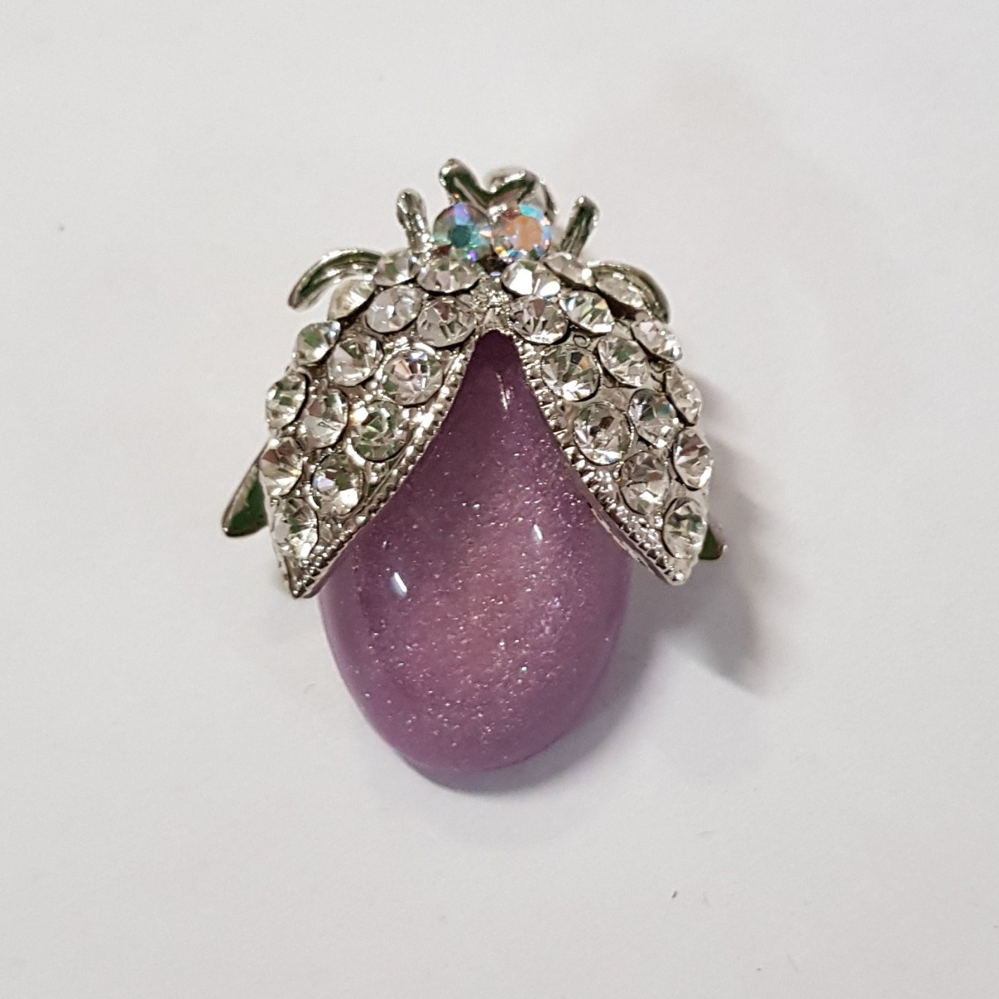 Spilla in metallo a forma di Coleottero scarafaggio con brillantini bianchi e corpo Lilla idea regalo o decorazione bomboniere matrimonio anniversario e altre occasioni .