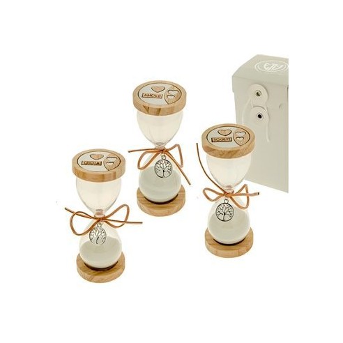 Bomboniera Clessidra legno Vetro con cuori scritte ciondolo albero Vita h 13 cm con scatola Set 3 pz art 07A061