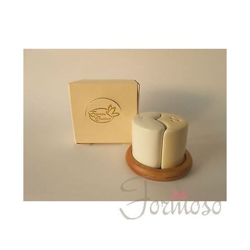 Set sale e pepe tondo a incastro in ceramica bianca e panna con piattino in legno tondo con scatola propria ideale per matrimonio anniversari e altre occasioni.