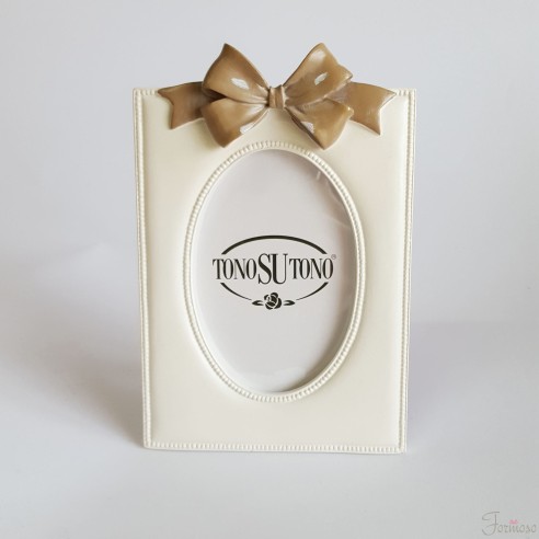 Porta foto resina bianca fiocco Kraft 140xh215 mm bomboniera art 23045