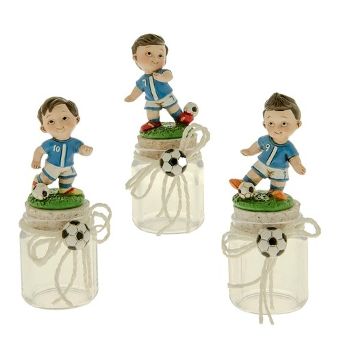 Bomboniera decorazione Statuina Baby Calciatore Azzurro in resina su Barattolo h 12 cm Confezione 3 pz art 04A282