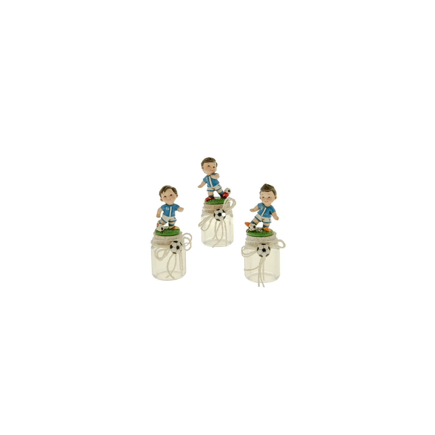 Bomboniera decorazione statuina set 3 Baby Calciatore azzurro varie figure in resina su Barattolo in vetro idea decorazione o Bomboniera