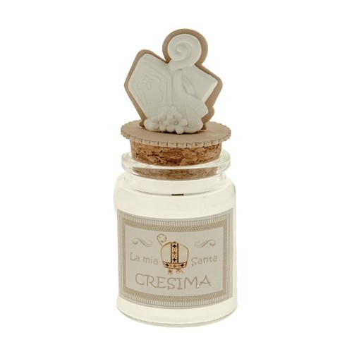 Bomboniera o decorazione Barattolo in vetro porta confetti con inserto tappo sughero con simbolo Cresima in Gesso ideale per decorazione o bomboniera o feste a tema