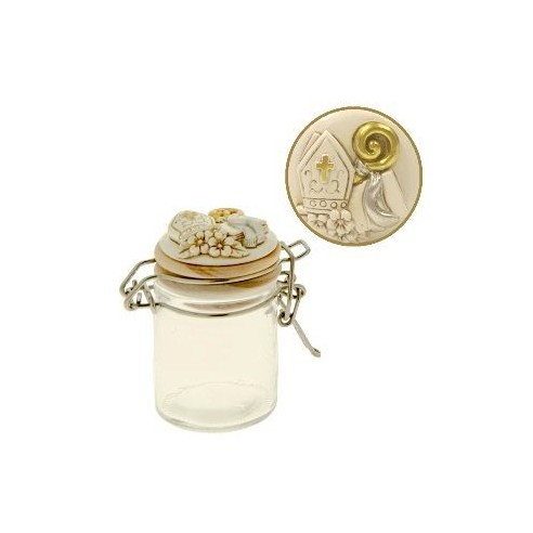 Bomboniera decorazione Barattolo tondo vetro con tappo ermetico e simbolo CRESIMA h 8 cm art 04A214