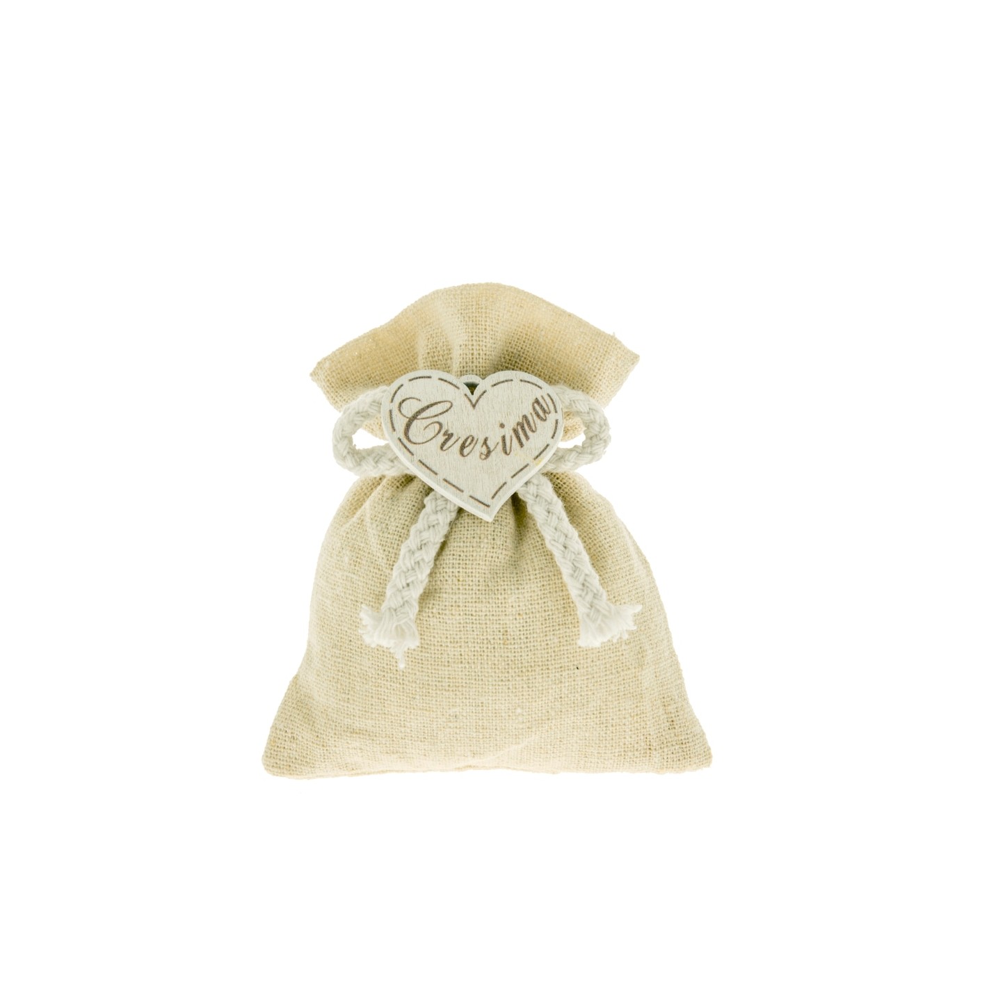 Sacchetto porta confetti in Tessuto Avorio con inserto targhetta a forma di cuore in legno con scritta Cresima ideale per bomboniera o decorazione .