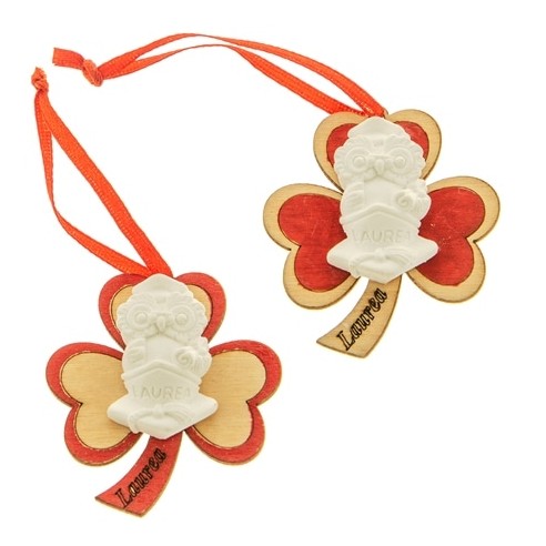 Ciondolo Gufo in gesso bianco con Quadrifoglio in Legno Rosso con scritta LAUREA 2 soggetti differenti idea decorazione Bomboniera .