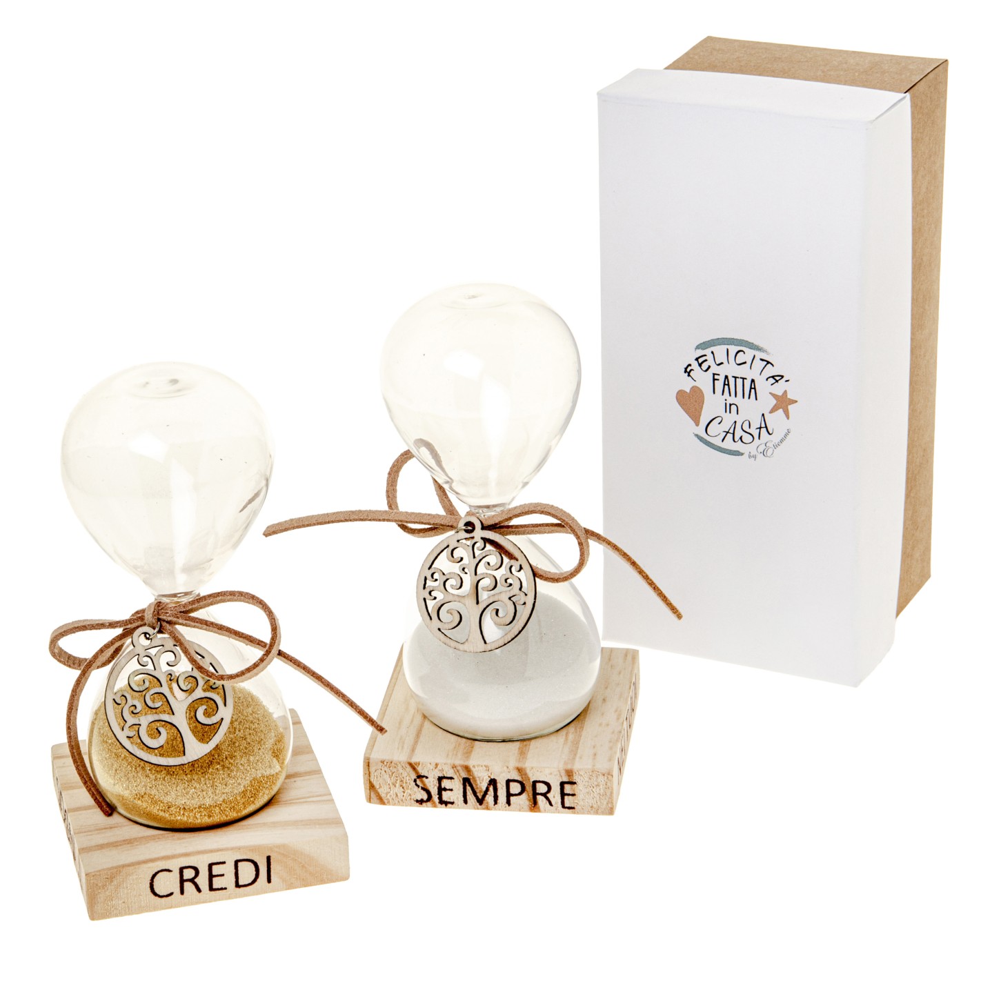 Bomboniera set 2 clessidra in vetro con ciondolo targhetta legno con albero della vita con sabbia colorata e base in legno con scritta , dotato di scatola propria
