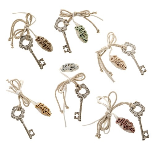 Bomboniera decorazione chiave porta fortuna in ferro anticato 13 cm con scritte confezione 6 pz art 12A100
