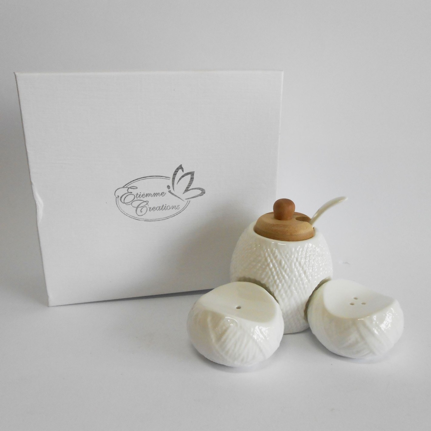 Set Zuccheriera con Sale e pepe in ceramica bianca e scatola propria ideale per matrimonio,anniversario e altre occasioni.