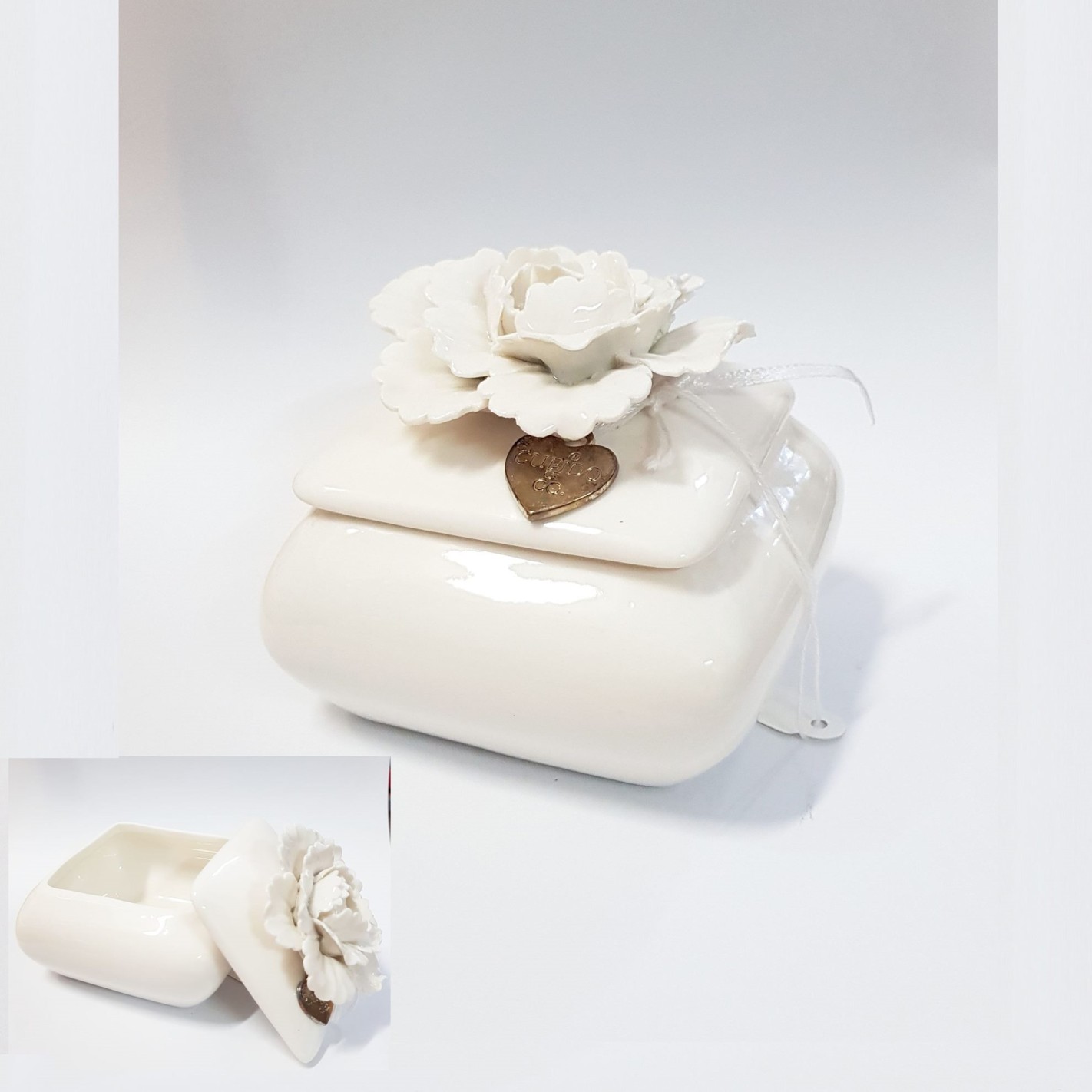 Bomboniera scatola con rosa bianca in ceramica smaltata bianca 9,5x9,5xh8 cm art 462