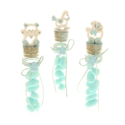 Fiala provetta in vetro tondo con tappo sughero ed inserto Orsetto carrozzine Cavallo a dondolo Celeste idea porta confetti , decorazione o bomboniera Nascita Battesimo Compleanno o festa a tema .