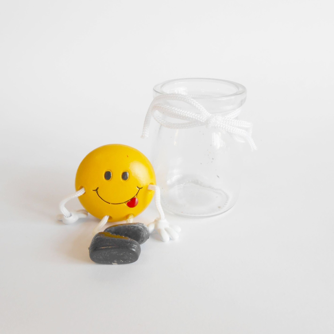 Bomboniera Barattolo in vetro con tappo resina inserto SMILE Giallo e piedini ideale come regalo o bomboniera Matrimonio Compleanno o feste a Tema .