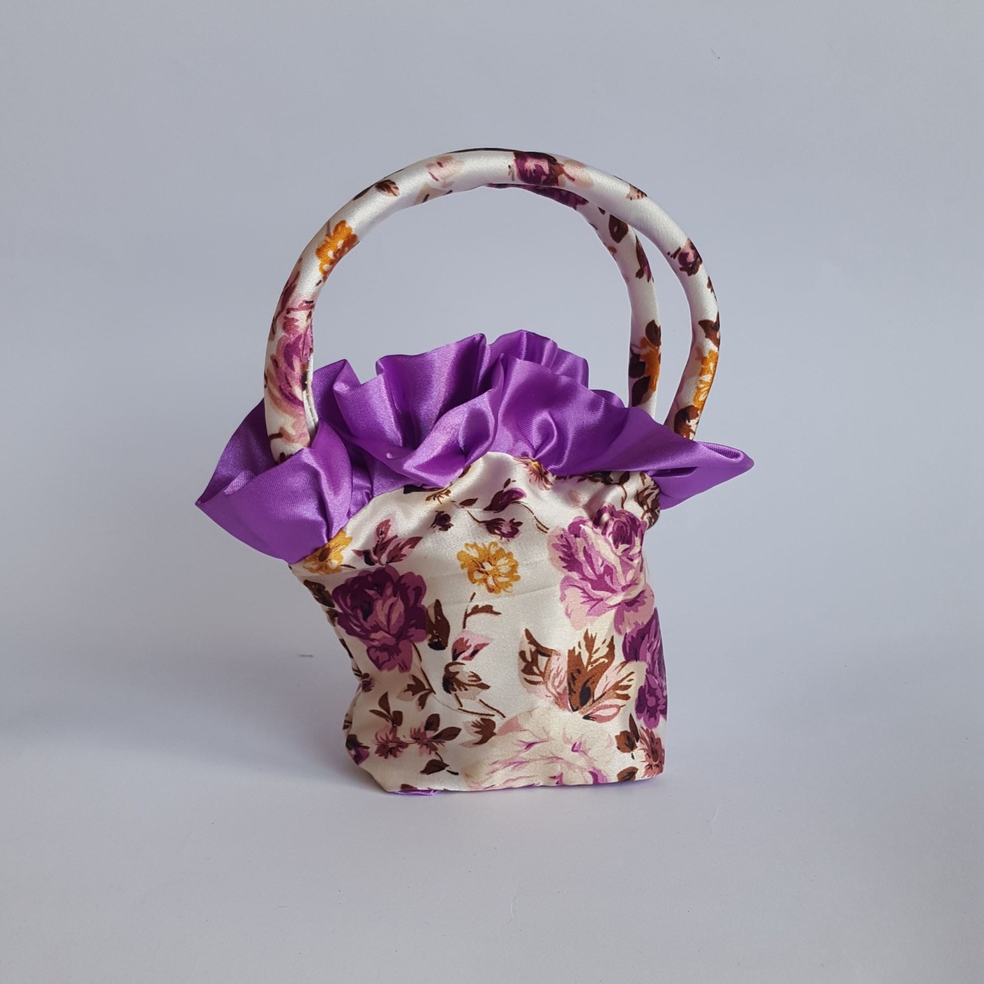 Sacchetto modello borsetta in tessuto rasato fiorato e Fuxia ideale per bomboniera confettate o decorazione Matrimonio , Anniversario ealtre occasioni.