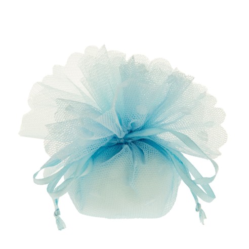Bomboniera Sacchetto tondo porta confetti con Tirante in organza CELESTE e pois in tinta D 24 cm Confezione 10 pz art C2440