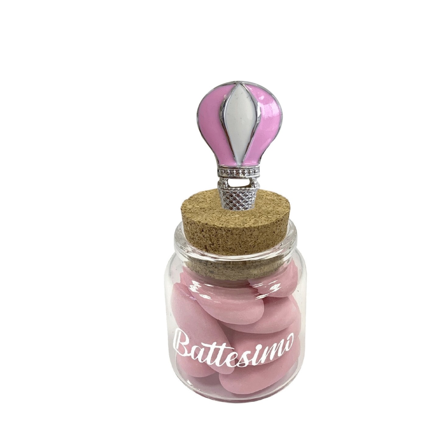 Barattolo in vetro tondo con tappo sughero ed inserto Mongolfiera Rosa e scritta BATTESIMO in bianco, porta confetti idea decorazione o bomboniera Nascita Battesimo o festa a Tema .