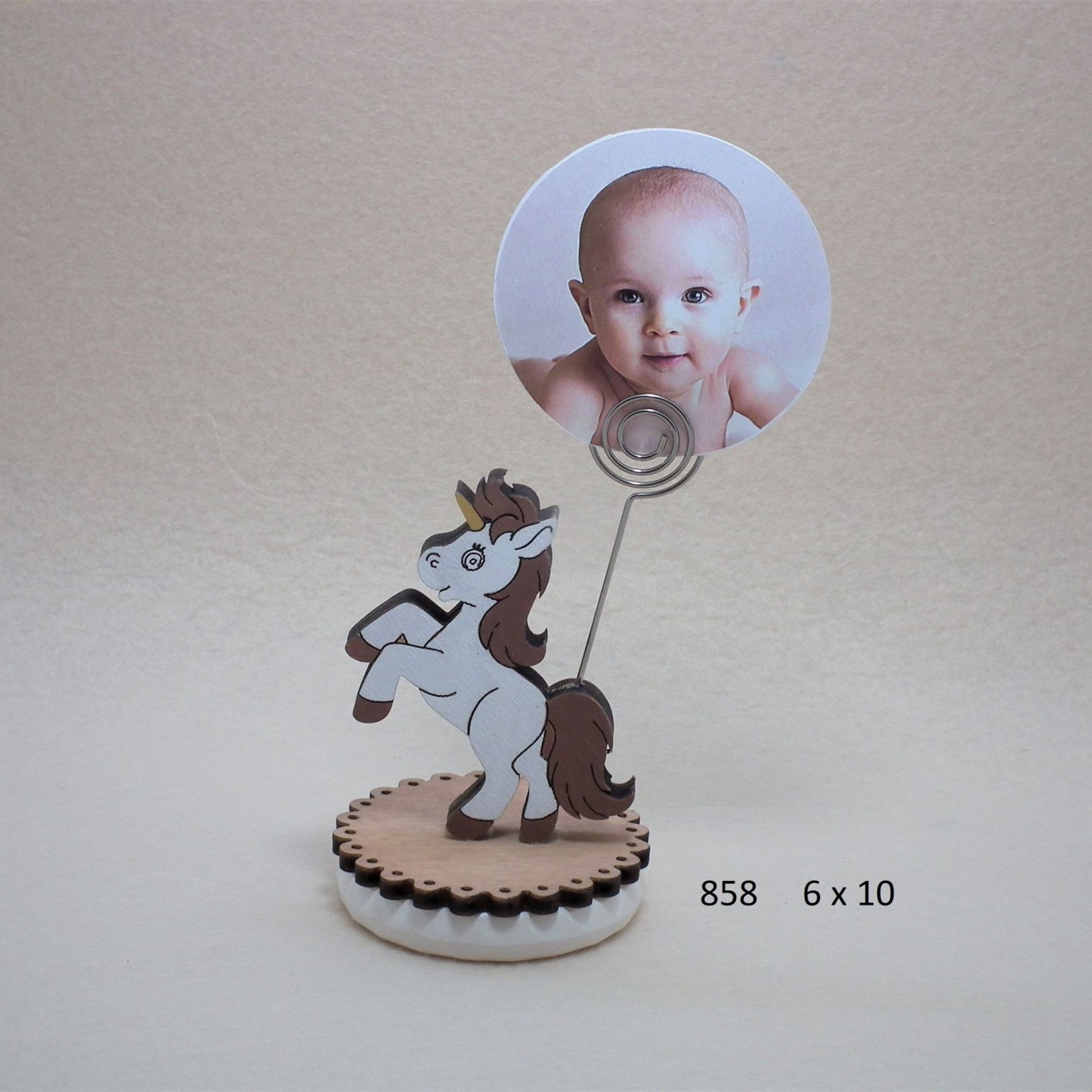 Bomboniera Porta foto in legno a forma di Unicorno Beige battesimo nascita 6 x h 10 cm art 858