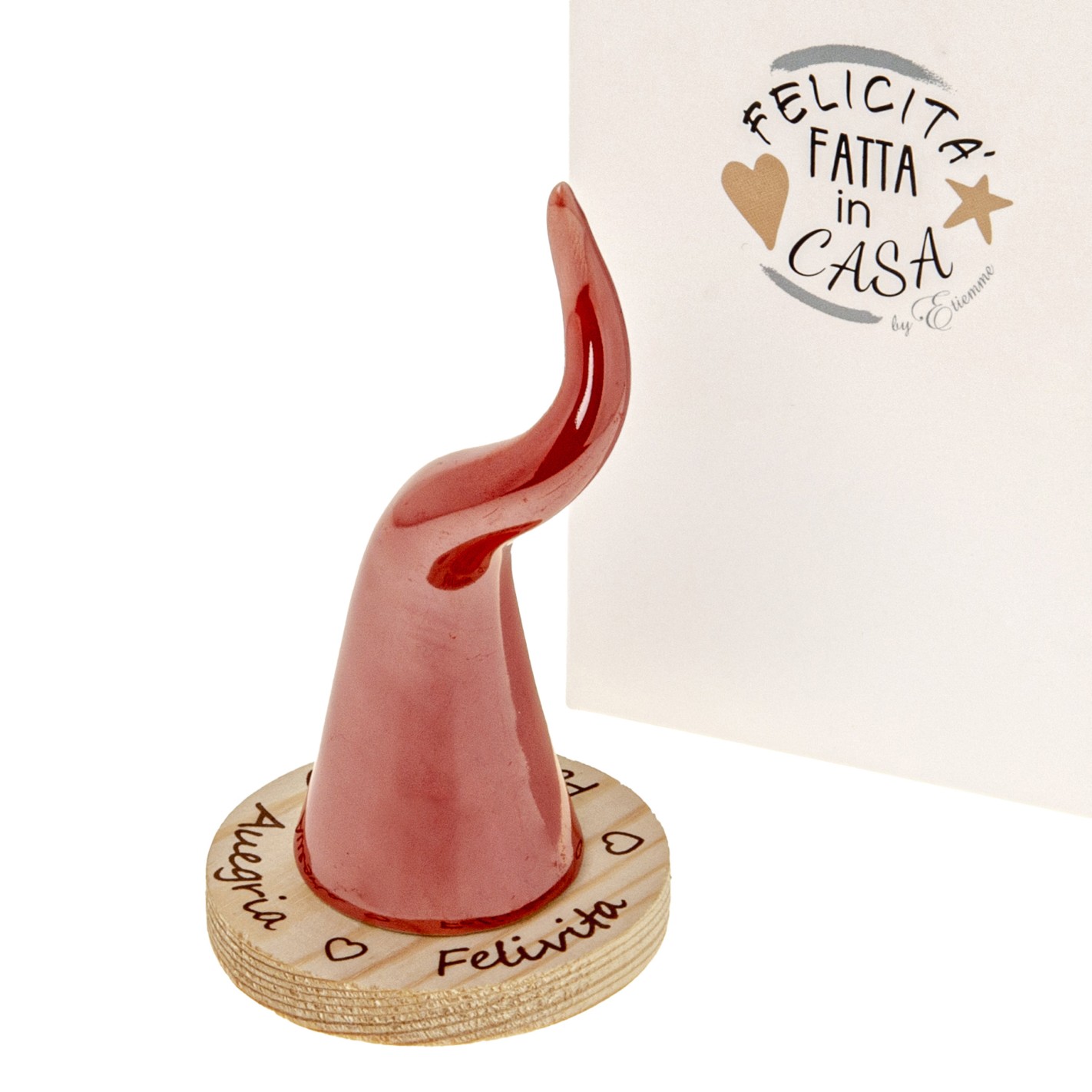 Bomboniera a forma corno porta fortuna in ceramica rossa e base in legno tonda dotato di scatola propria .