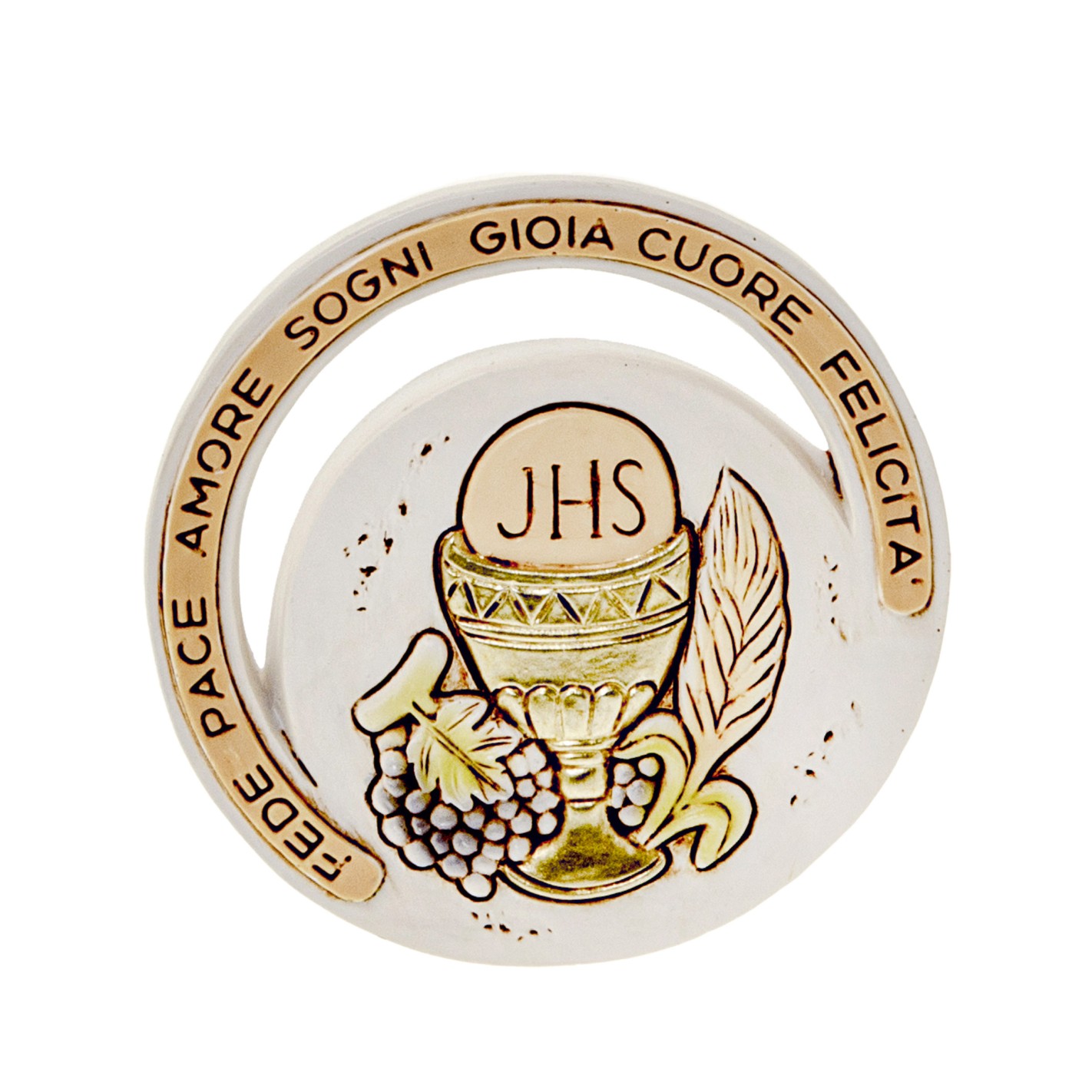 Bomboniera icona Comunione in resina tonda Avorio Dm 7,5 cm art 04A363