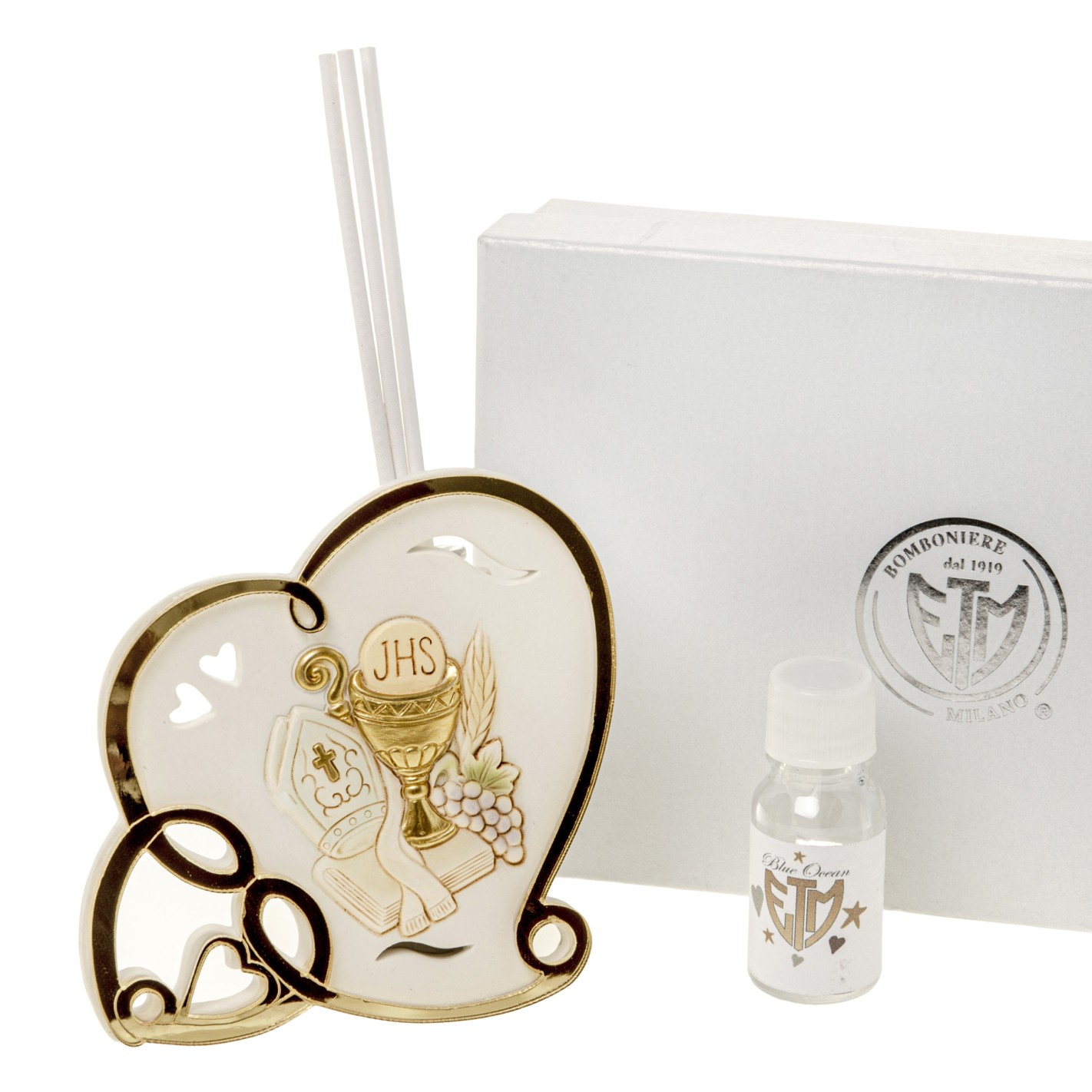 Bomboniera icona a forma di cuore con simbolo Comunione Cresima profumatore diffusore con Scatola propria.