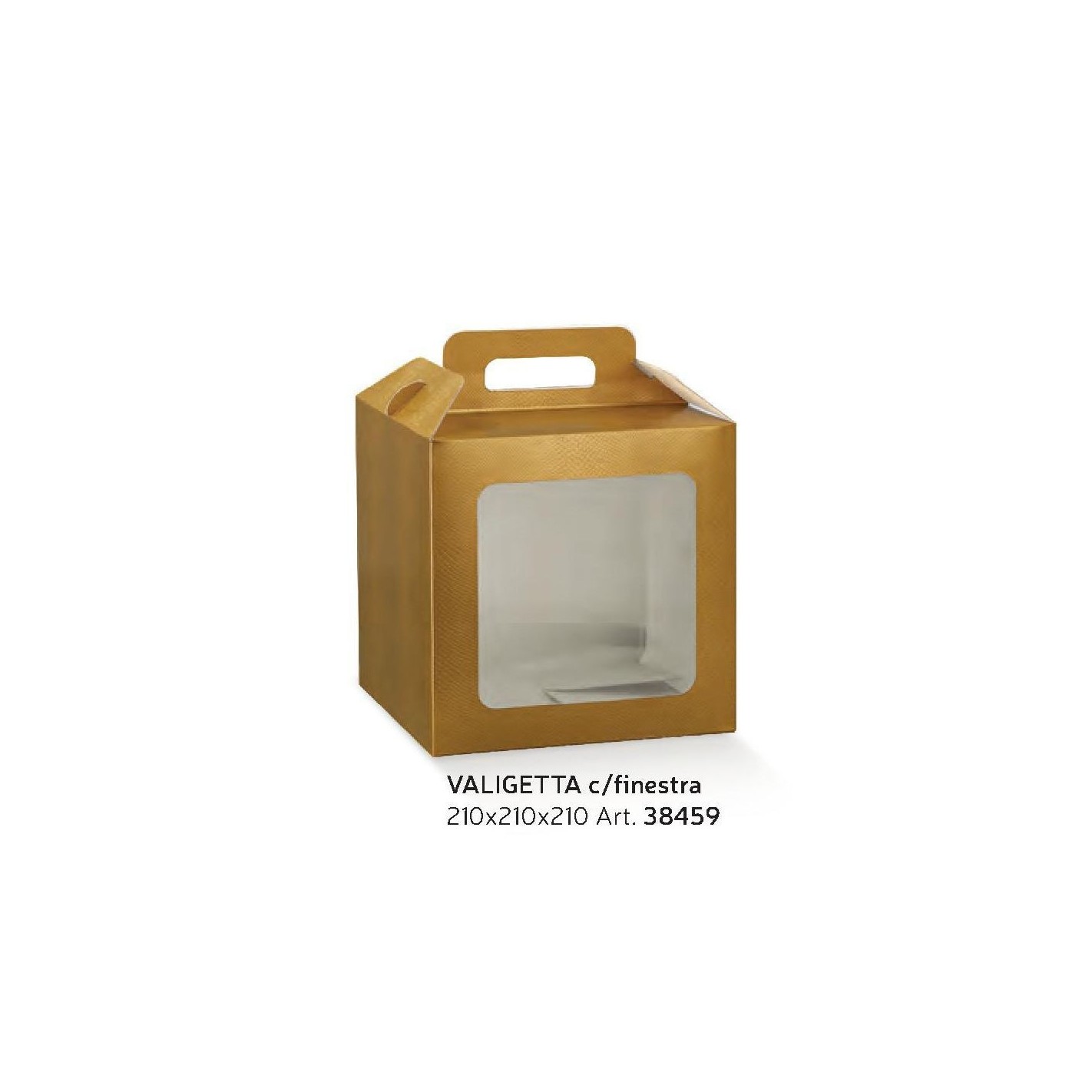 Scatola porta panettone per pasticceria Bar e altro, colore SKIN ORO modello VALIGETTA con finestra Trasparente marca Scotton ideale per Confezioni panettoni .
