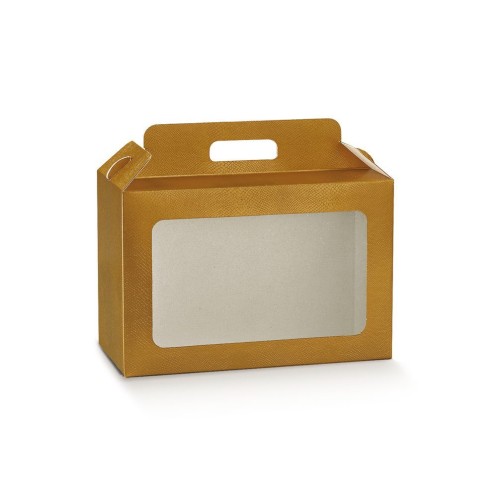 Scatola porta panettone per pasticceria Bar e altro, colore SKIN ORO modello VALIGETTA con finestra Trasparente marca Scotton ideale per Confezioni panettoni .